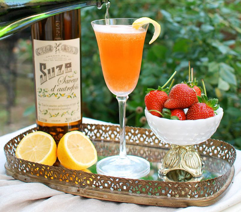 À gauche, un cocktail signature. C’est fête, champagne, gin, Suze et jus de citron. Le tout accompagné de quelques fraises et bienvenue au paradis de la boisson. (La recette.)